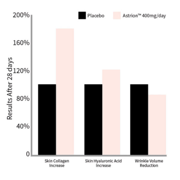 • Astrion - A key skincare ingredient that is clinically proven to improve hair thickness, the plumpness of skin and the production of collagen. Studies also show benefits in hyaluronic acid synthesis and general skin hydration. (4) The data below shows the results of astrion supplementation after just 28 days.