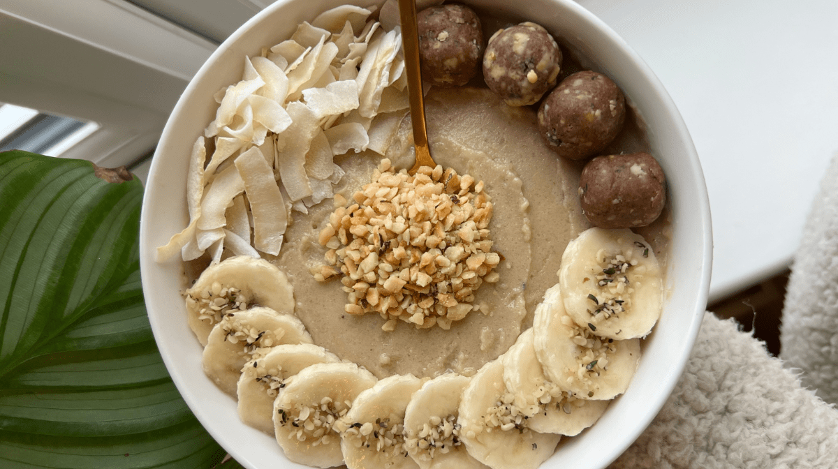 3. Add the mixture to your cooled bowl and add toppings. We've chosen MyVitamins Cookie Dough Vital Bites, sliced banana, coconut shavings and chopped hazelnuts.